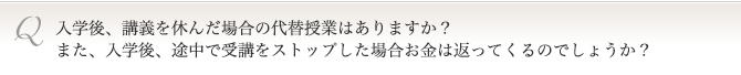 /academy/img/qa/qa7.gif” width =”670″ height =”68″ alt =”入学後、講義を休んだ場合の代替授業はありますか?また、入学後、途中で受講をストップした場合お金は返ってくるのでしょうか?” />- 当アカデミーに問題がある場合を除いては、いかなる場合も代替授業は行っておりません。返金については、受講生の方は中途解約、クーリングオフ制度を受ける権利がございます。